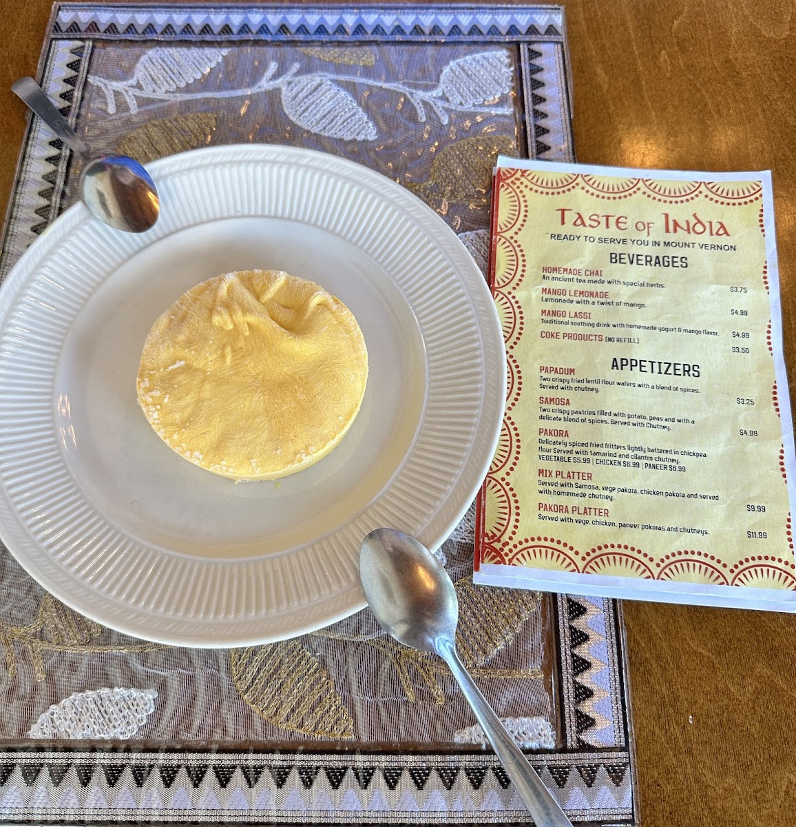 Two crispy fried lentil flour wafers with a blend of spices. Served with chutney.
